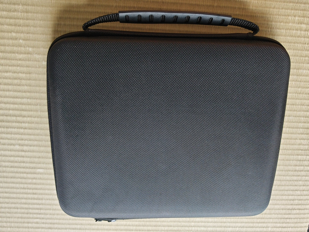 Bag / Soft case with custom EVA mold. Won't bend/cave in easily when sharing a space with board game boxes.