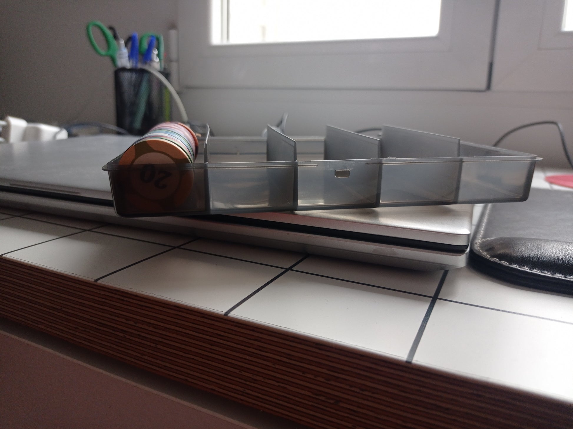 Las dimensiones de las cajas son 17x9,5x3 cm. Cada compartimento/ranura tiene 3,3 cm de ancho y capacidad para 20 fichas.
